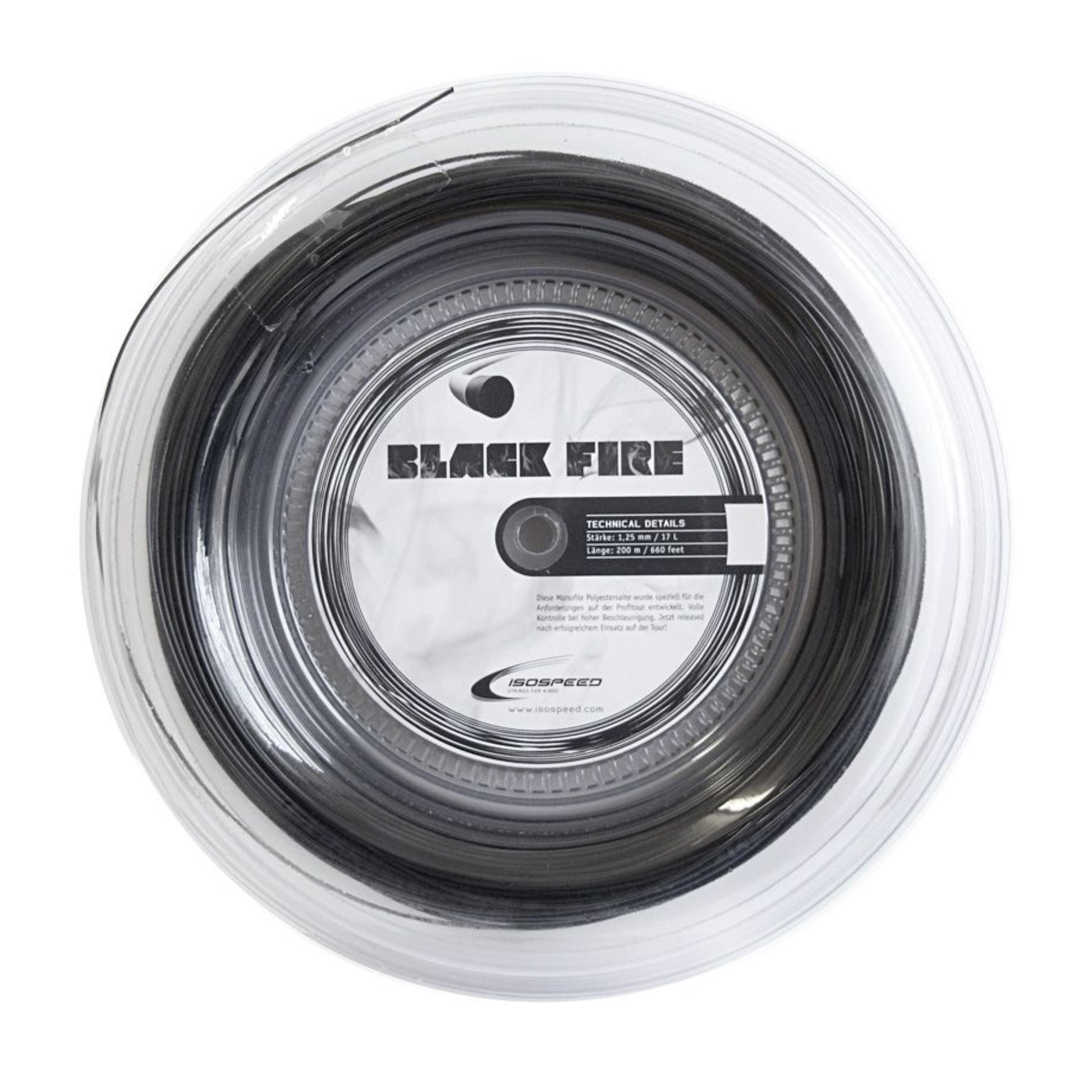 The ISOSPEED Black Fire 17 (1.25mm) is a co-polyester monofilament tennis string designed for advanced players seeking exceptional control, durability, and spin.